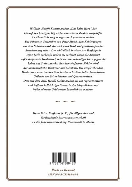 Wilhelm Hauffs Kunstmärchen "Das kalte Herz" hat bis auf den heutigen Tag nichts von seinem Zauber eingebüßt. An Aktualität mag es sogar noch gewonnen haben. Die bekannte Geschichte von Peter Munk, dem Köhlerjungen aus dem Schwarzwald, der sich nach Geld und gesellschaftlicher Anerkennung sehnt. Der schließlich in einer Art Teufelspakt seine Seele verkauft, indem er, verlockt durch die Aussicht auf unbegrenzte Geldmittel, sein warmes lebendiges Herz gegen ein kaltes aus Stein tauscht. Aus dem einfachen Köhler wird der unmenschliche Wucherer und Geizhals.Die vergleichenden Miniaturen verorten den Text in einem breiten kulturhistorischen Geflecht aus Seitenblicken und Querverweisen. Dies mit dem Ziel, Hauffs Geldmärchen als ein repräsentatives und äußerst hellsichtiges Szenario des bürgerlichen und frühmodernen Geldwesens kenntlich zu machen.