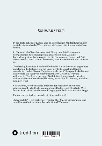 In der Tiefe geheimer Labore und an verborgenen Militärstützpunkten entsteht etwas, das die Welt, wie wir sie kennen, für immer verändern könnte.In China erhält Oberstleutnant Wei Zhang den Befehl, an einem hochgeheimen Forschungsprojekt zu arbeiten. Sein Ziel: die Entwicklung einer Technologie, die die Grenzen von Raum und Zeit überschreitet - doch schnell erkennt er, dass Kontrolle nur eine Illusion ist.Gleichzeitig kämpft in Russland Feldwebel Alexei Morosow gegen eine unbekannte Bedrohung, die tief unter der Erde lauert und längst erwacht ist. In den Gassen Taipeis versucht der CIA-Agent Luke Bennett verzweifelt, die Welt vor einer unsichtbaren Gefahr zu warnen, während in Nordkorea der junge Soldat Kim Seung-ho erkennt, dass wahrer Gehorsam manchmal bedeutet, nicht alles zu glauben, was ihm befohlen wird.Vier Männer, vier Schicksale, miteinander verwoben durch eine geheimnisvolle Macht, die niemand vollständig versteht. Als die Welt an den Rand eines unsichtbaren Krieges gerät, stellt sich nur eine Frage:Kannst du verhindern, was du nicht sehen kannst?"Schwarzfeld" - ein packender Thriller über Macht, Geheimnisse und den dünnen Grat zwischen Fortschritt und Wahnsinn.