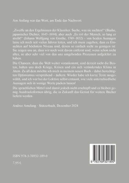 Am Anfang war das Wort, am Ende das Nachwort. "Zweifle an den Ergebnissen der Klassiker. Suche, was sie suchten!" (Basho, japanischer Dichter, 1643-1694), aber auch "Es irrt der Mensch, so lang er strebt!" (Johann Wolfgang von Goethe, 1749-1832) - von beiden Aussagen lasse ich mich seit vielen Jahren leiten, und ich muss zugeben, dass es Einsichten auf höchstem Niveau sind, denen so einfach nicht zu genügen ist: Sie zeigen uns an, dass wir noch weit davon entfernt sind, wenn schon nicht alles, so aber sehr viel von den uns umgebenden Prozessen aufgeklärt zu haben. Die Chancen, dass die Welt weiter vorankommt, sind derzeit nicht die Besten, halten uns doch Kriege, Krisen und ein sich veränderndes Klima in Atem. Zu all dem möchte ich mich in meinem neuen Buch - dabei berechtigten Optimismus versprühend - äußern: Wieder habe ich kurze Texte ausgewählt, und ich war bei der Lektüre selbst erstaunt, wie viele unterschiedliche Aussagen sich in wenige Worte packen lassen! Die sprachlichen Mittel sind damit jedoch nicht erschöpft und es bleiben genug Ausdrucksformen übrig, die in Zukunft das Gerüst für weitere Bücher liefern werden. Andree Amelang · Stützerbach, Dezember 2024