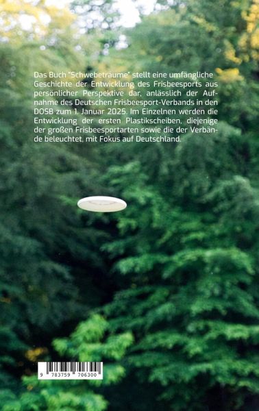 Das Buch "Schwebeträume" stellt eine umfängliche Geschichte der Entwicklung des Frisbeesports aus persönlicher Perspektive dar, anlässlich der Aufnahme des Deutschen Frisbeesport-Verbands in den DOSB zum 1. Januar 2025. Im Einzelnen werden die Entwicklung der ersten Plastikscheiben, diejenige der großen Frisbeesportarten sowie die der Verbände beleuchtet, mit Fokus auf Deutschland.