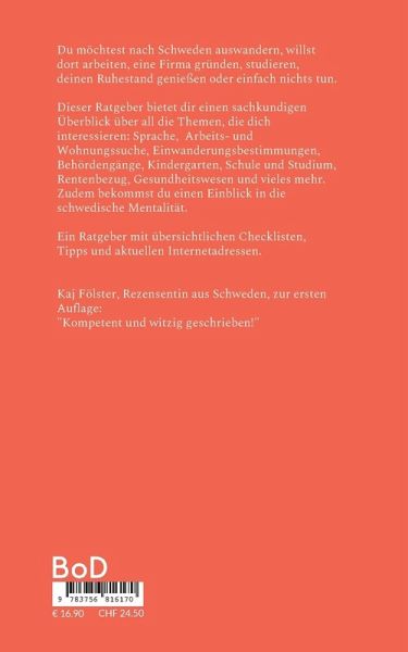 Du möchtest nach Schweden auswandern, willst dort arbeiten, eine Firma gründen, studieren, deinen Ruhestand genießen oder einfach nichts tun.Dieser Ratgeber bietet dir einen sachkundigen Überblick über all die Themen, die dich interessieren: Sprache, Arbeits- und Wohnungssuche, Einwanderungsbestimmungen, Behördengänge, Kindergarten, Schule und Studium, Rentenbezug, Gesundheitswesen und vieles mehr. Zudem bekommst du einen Einblick in die schwedische Mentalität.Ein Ratgeber mit übersichtlichen Checklisten, Tipps und aktuellen Internetadressen.Kaj Fölster, Rezensentin aus Schweden, zur ersten Auflage: "Kompetent und witzig geschrieben!"