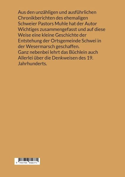Aus den unzähligen und ausführlichen Chronikberichten des ehemaligen Schweier Pastors Muhle hat der Autor Wichtiges zusammengefasst und auf diese Weise eine kleine Geschichte der Entstehung der Ortsgemeinde Schwei in der Wesermarsch geschaffen. Ganz nebenbei lehrt das Büchlein auch Allerlei über die Denkweisen des 19. Jahrhunderts.
