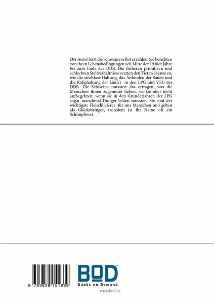 Der Autor lässt die Schweine selbst erzählen. Sie berichten von ihren Lebensbedingungen seit Mitte der 1930er Jahre bis zum Ende der DDR. Primitive und schlechte Stallverhältnisse in der Zeit bis Ende der 1940er Jahre setzten den Tieren ebenso zu, wie die strohlose Haltung, das Anbinden der Sauen und die Käfighaltung der Läufer in den LPG und VEG der DDR; hierzu werden zahlreiche Beispiele dargestellt. Die Schweine mussten das ertragen, was die Menschen ihnen zugemuteten, sie konnten nicht aufbegehren, wenn sie in den Gründerjahren der LPG sogar manchmal Hunger leiden mussten. Sie sind der wichtigste Fleischlieferer für uns Menschen und gelten als Glücksbringer, trotzdem ist ihr Name oft ein Schimpfwort.