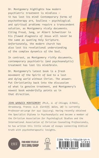 John Warwick Montgomery beautifully highlights how modern psychiatric treatment has lost its mind! Contemporary forms of psychotherapy are, soulless-psychological and spiritual problems require a transcendent solution, as Montgomery nicely documents. No citation of Freud, Jung, or Albert Schweitzer in his flawed diagnosis of Jesus will never be the same as quoting Holy Scripture. Dr. Montgomery's latest book is a fresh movement of the Spirit of God to a lost and dying world without Christ. The answer: Put Christianity back into the discussion of what is genuine treatment, and Montgomery's newest book wonderfully points us in that direction.