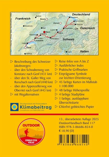 Einen einzigen zentralen Jakobsweg durch die Schweiz gab es im Mittelalter nicht, vielmehr bildeten die verschiedenen Strecken ein ganzes Wegenetz. Zusätzlich zur heute markierten Hauptroute beschreibt Hartmut Engel deshalb auch einige reizvolle Wegalternativen und Abstecher. Gleich für die ersten Etappen vom Bodensee nach Einsiedeln in der Zentralschweiz werden zwei alternative Strecken vorgestellt, von denen eine in Rorschach und eine in Konstanz beginnt. Ab Einsiedeln führt der Weg dann vorbei an Vierwaldstätter-, Brienzer- und Thunersee weiter nach Lausanne am Genfersee und zum Endpunkt in Genf.Hartmut Engel beschreibt den ca. 440 km langen Weg von Unterkunft zu Unterkunft, sodass jeder Pilger seine Tagesetappen individuell zusammenstellen kann. Karten, Höhenprofile und GPS-Tracks erleichtern unterwegs die Orientierung. Ergänzend finden sich in dem OutdoorHandbuch interessante Informationen zu Natur und Landschaft sowie zu Kultur und Geschichte der Region, wobei besonders aufdie Geschichte der Pilgerschaft eingegangen wird. Bei der Vorbereitung der Pilgerwanderung hilft ein einleitendes Kapitel mit "Reise-Infos von A bis Z", z. B. zu Karten, Markierungen und Unterkünften.