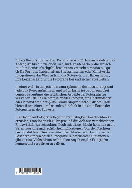 In einer Welt, in der jeder ein Smartphone in der Tasche trägt und jederzeit Fotos aufnehmen und teilen kann, ist es von entscheidender Bedeutung, die rechtlichen Aspekte der Fotografie zu verstehen. Ob Sie ein professioneller Fotograf, ein Hobbyfotograf oder jemand sind, der gerne Erinnerungen festhält, dieses Buch bietet Ihnen einen umfassenden Einblick in die Grundlagen des Fotorechts in der Schweiz.Die Macht der Fotografie liegt in ihrer Fähigkeit, Geschichten zu erzählen, Emotionen einzufangen und die Welt aus verschiedenen Blickwinkeln zu betrachten. Doch mit dieser Macht kommen auch Verantwortung und rechtliche Implikationen. Von den Rechten der abgebildeten Personen über das Urheberrecht bis hin zu den Beschränkungen bei der Fotografie in bestimmten Situationen gibt es eine Vielzahl von rechtlichen Aspekten, die Fotografen kennen und respektieren sollten.Dieses Buch richtet sich an Fotografen aller Erfahrungsstufen, von Anfängern bis hin zu Profis, und auch an Menschen, die einfach nur ihre Rechte als abgebildete Person verstehen möchten. Egal, ob Sie Porträts, Landschaften, Strassenszenen oder Kunstwerke fotografieren, das Wissen über das Fotorecht wird Ihnen helfen, Ihre Leidenschaft für die Fotografie frei und sicher auszuleben.