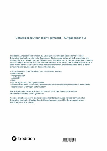 Der Aufgabenband 2 deckt die Kapitel 7 bis 11 des gleichnamigen Grammatikbuches ab. Du findest darin zahlreiche Übungen zu zentralen Eigenheiten des Dialekts wie er im Grossraum Zürich gesprochen wird. Schweizerdeutsch unterscheidet sich in zahlreichen Punkten deutlich vom Hochdeutschen. Dazu zählt die Bildung der Vergangenheit, die Bildung des Akkusativ und vor allem die Bildung des Dativs. Sätze mit Modalverben unterscheiden sich ebenfalls klar vom Hochdeutschen. Auch dazu enthält der Aufgabenband zahlreiche Übungen. Die zentralen Grammatikpunkte sind zu Beginn von jedem Kapitel kurz zusammengefasst. Am Schluss des Bandes sind alle grammatischen Formen findet man in Übersichten zusammengefasst. Der Lösungsschlüssel erleichtert das Lernen im Selbststudium.
