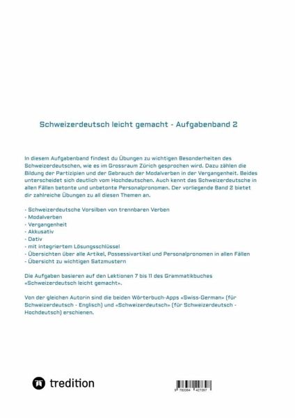 Der Aufgabenband 2 deckt die Kapitel 7 bis 11 des gleichnamigen Grammatikbuches ab. Du findest darin zahlreiche Übungen zu zentralen Eigenheiten des Dialekts wie er im Grossraum Zürich gesprochen wird. Schweizerdeutsch unterscheidet sich in zahlreichen Punkten deutlich vom Hochdeutschen. Dazu zählt die Bildung der Vergangenheit, die Bildung des Akkusativ und vor allem die Bildung des Dativs. Sätze mit Modalverben unterscheiden sich ebenfalls klar vom Hochdeutschen. Auch dazu enthält der Aufgabenband zahlreiche Übungen. Die zentralen Grammatikpunkte sind zu Beginn von jedem Kapitel kurz zusammengefasst. Am Schluss des Bandes sind alle grammatischen Formen findet man in Übersichten zusammengefasst. Der Lösungsschlüssel erleichtert das Lernen im Selbststudium.