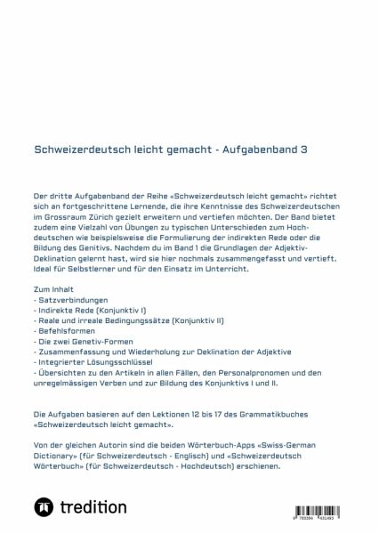 Mit dem Aufgabenband 3 vertiefst du deine Kenntnisse im Schweizerdeutschen wie es im Grossraum Zürich gesprochen wird. Schweizerdeutsch leicht gemacht - Aufgabenband 3 bietet eine Vielzahl von Übungen zu typischen Eigenheiten des Schweizerdeutschen wie beispielsweise die Formulierung der indirekten Rede oder die Bildung der beiden Genitivformen. Spannend ist, dass die schweizerdeutschen Genetivformen dem Englischen viel näher liegen als dem Hochdeutschen. Die Lektion zu den Satzverbindungen motiviert zum Formulieren von längeren und komplexeren Sätzen. Wie in allen Sprachen stellt die Adjektiv-Deklination eine besondere Herausforderung dar. Deshalb wird sie im Aufgabenband 3 nochmals kompakt zusammengefasst, wiederholt und vertieft. Schweizerdeutsch leicht gemacht - Aufgabenband 3 entspricht den Lektionen 12 bis 17 des gleichnamigen Grammatikbuches. Zu Beginn jedes Kapitels findest du eine kurze Zusammenfassung der relevanten Grammatik. Der integrierte Lösungsschlüssel und die Übersichten im Anhang erleichtern das Lernen im Selbststudium. Der Aufgabenband 3 eigenet sich aber auch als Unterrichtsmaterial für Schulen.-
