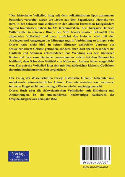 Dieses Buch über die Schweizerischen Volkslieder, mit Einleitung und Anmerkungen, ist ein unveränderter, hochwertiger Nachdruck der Originalausgabe aus dem Jahr 1882.