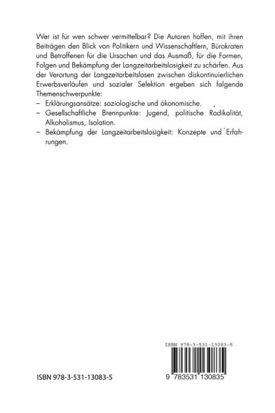 Wer ist für wen schwer vermittelbar? Die Autoren hoffen, mit ihren Beiträgen den Blick von Politikern und Wissenschaftlern, Bürokraten und Betroffenen für die Ursachen und das Ausmaß, für die Formen, Folgen und Bekämpfung der Langzeitarbeitslosigkeit zu schärfen. Aus der Verortung der Langzeitarbeitslosen zwischen diskontinuierlichen Erwerbsverläufen und sozialer Selektion ergeben sich folgende Themenschwerpunkte: soziologische und ökonomische Erklärungsansätze, gesellschaftliche Brennpunkte: Jugend, politische Radikalität, Alkoholismus und Isolation sowie Konzepte und Erfahrungen bei der Bekämpfung der Langzeitarbeitslosigkeit.