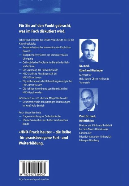 Für Sie auf den Punkt gebracht, was im Fach diskutiert wird. Schwerpunktthema der HNO-Praxis heute, Band 23 ist die Halswirbelsäule: Besonderheiten der Innervation des Kopf-Hals-Bereichs, Bildgebung der Halswirbelsäule, Orthopädische Probleme im Bereich der Halswirbelsäule, Die Distorsion der Halswirbelsäule, HNO-ärztliche Akutdiagnostik bei HWS-Distorsionen, Physiotherapeutische Behandlungskonzepte bei HWS-Beschwerden, Die richtige Verordnung von Krankengymnastik bei HWS-Beschwerden. Informieren Sie sich über die Möglichkeiten der Strahlentherapie bei gutartigen Erkrankungen im Kopf-Hals-Bereich. Auch dieser Band mit Fragensammlung zur Selbstkontrolle und Themenverzeichnis der bisher erschienenen Bände.
