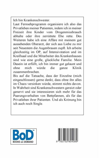 Ich bin Krankenschwester.Laut Fernsehprogramm organisiere ich also das Privatleben meiner Patienten, indem ich in meiner Freizeit ihre Kinder vom Drogenmissbrauch abhalte oder ihre zerrüttete Ehe rette. Des Weiteren habe ich eine Affäre mit meinem gut aussehenden Oberarzt, der sich aus Liebe zu mir seit Neuestem die Augenbrauen zupft. Ich arbeite gleichzeitig im OP, auf Intensivstation und im Kreißsaal und die Mitarbeiter des Krankenhauses sind wie eine große, glückliche Familie. Mein Dasein ist erfüllt, ich bin immer gut gelaunt und ohne mich würde die ganze Klinik zusammenbrechen. Bis auf die Tatsache, dass der Einzelne (mich eingeschlossen) gerne denkt, dass ohne ihn alles im Chaos versinken würde, stimmt nichts davon. In Wahrheit sind Krankenschwestern gereizt oder genervt und sie interessieren sich mehr für das Paarungsverhalten von Bettpfannen, als für das Privatleben ihrer Patienten. Und als Krönung bin ich auch noch Single.