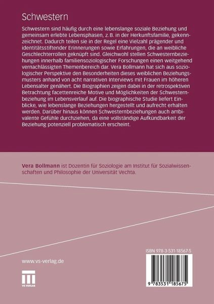 Schwestern sind häufig durch eine lebenslange soziale Beziehung undgemeinsam erlebte Lebensphasen, z. B. in der Herkunftsfamilie, gekennzeichnet.Dadurch teilen sie in der Regel eine Vielzahl prägender undidentitätsstiftender Erinnerungen sowie Erfahrungen, die an weiblicheGeschlechterrollen geknüpft sind. Gleichwohl stellen Schwesternbeziehungeninnerhalb familiensoziologischer Forschungen einen weitgehendvernachlässigten Themenbereich dar. Vera Bollmann hat sich aus soziologischerPerspektive den Besonderheiten dieses weiblichen Beziehungsmustersanhand von acht narrativen Interviews mit Frauen im höherenLebensalter genähert. Die Biographien zeigen dabei in der retrospektivenBetrachtung facettenreiche Motive und Möglichkeiten der Schwesternbeziehungim Lebensverlauf auf. Die biographische Studie liefert Einblicke,wie lebenslange Beziehungen hergestellt und aufrecht erhaltenwerden. Darüber hinaus können Schwesternbeziehungen auch ambivalenteGefühle durchziehen, da eine vollständige Aufkündbarkeit derBeziehung potenziell problematisch erscheint.