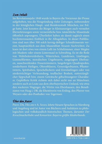 Im Revolutionsjahr 1848 wurde in Bayern die Vorzensur der Presse aufgehoben, was die Neugründung vieler Zeitungen, insbesondere in der königlichen Haupt- und Residenzstadt München, zur Folge hatte. Jetzt konnten die Bürger in Kleinanzeigen auch vermehrt Ehrverletzungen sowie vermeintliche bzw. tatsächliche Missstände öffentlich anprangern. Überliefert haben sie damit zugleich einen hochinteressanten Einblick in ihr Alltagsleben. In dieser Publikation sind nun über 300 solch kernig-deftiger Schmähinserate vereint, hauptsächlich aus dem Massenblatt Neueste Nachrichten. Zu lesen ist dort etwa von einem Lalli im Schlafzimmer, einer Megäre mit Muskete oder einem Lästermaul in Schwabing. Es ist die Rede von Wahrheitsverdrehern, Wüterichen, Lustdirnen, Lüstlingen, Lümmelfürsten, moralischen Ungeheuern, ausgejagten Ehefrauen, ausschweifenden Frauenzimmern, langohrigen Quadrupeden, sonderbaren Heiligen, Ohrenbläsern, Generalgrobianen, Pflastertretern, Spitzbuben, Speichelleckern und Erzwüstlingen oder von niederträchtiger Verleumdung, teuflischer Bosheit, natterzünglicher Sippschaft bzw. einem Geträtsche giftschwangerer Charaktere. Gepfefferte Kritik richtete sich dabei nicht nur an Münchner, sondern auch an Leute aus dem oberbayerischen Umland, wie etwa den wackeren Waginger, die Wirtin von Ebenhausen, den Benefiziaten von Haag i. OB, die Ehestörerin von Erding, den Pfarrer von Weyarn oder den Posthalter von Tegernsee.