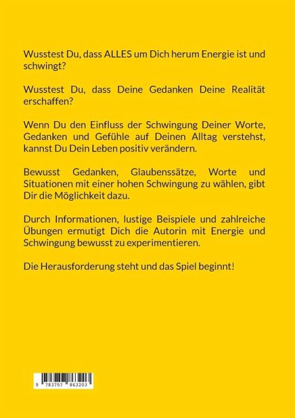 Wusstest Du, dass ALLES um Dich herum Energie ist und schwingt? Wusstest Du, dass Deine Gedanken Deine Realität erschaffen?Wenn Du den Einfluss der Schwingung Deiner Worte, Gedanken und Gefühle auf Deinen Alltag verstehst, kannst Du Dein Leben positiv verändern. Bewusst Gedanken, Glaubenssätze, Worte und Situationen mit einer hohen Schwingung zu wählen, gibt Dir die Möglichkeit dazu. Durch Informationen, lustige Beispiele und zahlreiche Übungen ermutigt Dich die Autorin mit Energie und Schwingung bewusst zu experimentieren. Die Herausforderung steht und das Spiel beginnt!