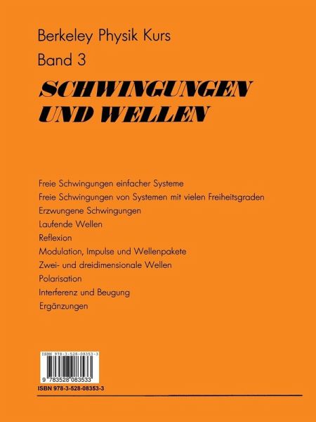 1. Freie Schwingungen einfacher Systeme.- 2. Freie Schwingungen von Systemen mit vielen Freiheitsgraden.- 3. Erzwungene Schwingungen.- 4. Laufende Wellen.- 5. Reflexion.- 6. Modulationen, Impulse und Wellenpakete.- 7. Zwei- und dreidimensionale Wellen.- 8. Polarisation.- 9. Interferenz und Beugung.- 10. Ergänzungen.- A.1. Die Taylor-Reihe.- A.2. Häufig gebrauchte Reihen.- A.3. Überlagerung harmonischer Funktionen.- A.4. Vektoridentitäten.- Sachwortverzeichnis.