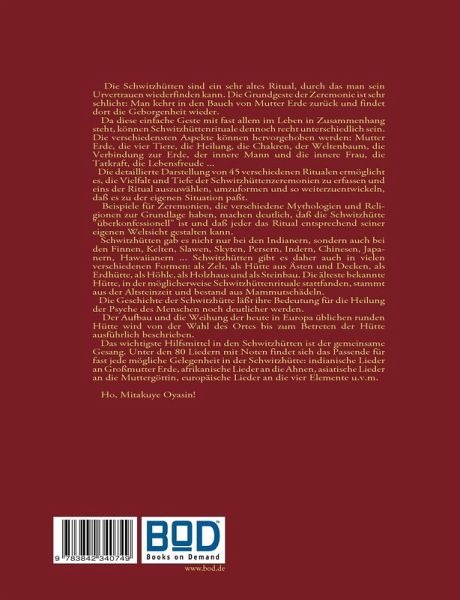 Die Schwitzhütten sind ein sehr altes Ritual, durch das man sein Urvertrauen wiederfinden kann. Die Grundgeste der Zeremonie ist sehr schlicht: Man kehrt in den Bauch von Mutter Erde zurück und findet dort die Geborgenheit wieder. Da diese einfache Geste mit fast allem im Leben in Zusammenhang steht, können Schwitzhüttenrituale dennoch recht unterschiedlich sein. Die verschiedensten Aspekte können hervorgehoben werden: Mutter Erde, die vier Tiere, die Heilung, die Chakren, der Weltenbaum, die Verbindung zur Erde, der innere Mann und die innere Frau, die Tatkraft, die Lebensfreude ... Die detaillierte Darstellung von 45 verschiedenen Ritualen ermöglicht es, die Vielfalt und Tiefe der Schwitzhüttenzeremonien zu erfassen und eins der Ritual auszuwählen, umzuformen und so weiterzuentwickeln, daß es zu der eigenen Situation paßt. Beispiele für Zeremonien, die verschiedene Mythologien und Religionen zur Grundlage haben, machen deutlich, daß die Schwitzhütte "überkonfessionell" ist und daß jeder das Ritual entsprechend seiner eigenen Weltsicht gestalten kann. Schwitzhütten gab es nicht nur bei den Indianern, sondern auch bei den Finnen, Kelten, Slawen, Skyten, Persern, Indern, Chinesen, Japanern, Hawaiianern ... Schwitzhütten gibt es daher auch in vielen verschiedenen Formen: als Zelt, als Hütte aus Ästen und Decken, als Erdhütte, als Höhle, als Holzhaus und als Steinbau. Die älteste bekannte Hütte, in der möglicherweise Schwitzhüttenrituale stattfanden, stammt aus der Altsteinzeit und bestand aus Mammutschädeln. Die Geschichte der Schwitzhütte läßt ihre Bedeutung für die Heilung der Psyche des Menschen noch deutlicher werden. Der Aufbau und die Weihung der heute in Europa üblichen runden Hütte wird von der Wahl des Ortes bis zum Betreten der Hütte ausführlich beschrieben. Das wichtigste Hilfsmittel in den Schwitzhütten ist der gemeinsame Gesang. Unter den 80 Liedern mit Noten findet sich das Passende für fast jede mögliche Gelegenheit in der Schwitzhütte: indianische Lieder an Großmutter Erde, afrikanische Lieder an die Ahnen, asiatische Lieder an die Muttergöttin, europäische Lieder an die vier Elemente u.v.m. Ho, Mitakuye Oyasin!