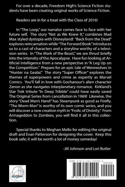 This collection of short stories are submitted by the graduating seniors of Freedom High School that are enrolled in Jill Johnson's science fiction class. It was edited by student Meghan Mello and Graphic Design teacher Lori Butler in collaboration with Jill Johnson. The publishing of the book was sponsored by the Communications Academy and the artwork was submitted by Evan Patterson.