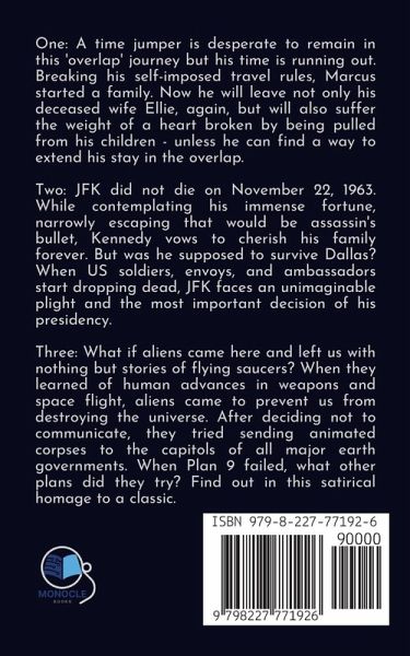 One: A time jumper is desperate to remain in this 'overlap' journey but his time is running out. Breaking his self-imposed travel rules, Marcus started a family. Now he will leave not only his deceased wife Ellie, again, but will also suffer the weight of a heart broken by being pulled from his children - unless he can find a way to extend his stay in the overlap. Two: JFK did not die on November 22, 1963. While contemplating his immense fortune, narrowly escaping that would be assassin's bullet, Kennedy vows to cherish his family forever. But was he supposed to survive Dallas? When US soldiers, envoys, and ambassadors start dropping dead, JFK faces an unimaginable plight and the most important decision of his presidency. Three: What if aliens came here and left us with nothing but stories of flying saucers? When they learned of human advances in weapons and space flight, aliens came to prevent us from destroying the universe. After deciding not to communicate, they tried sending animated corpses to the capitols of all major earth governments. When Plan 9 failed, what other plans did they try? Find out in this satirical homage to a classic.