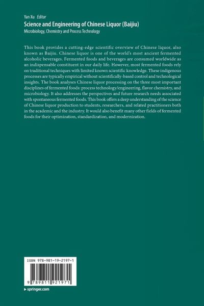 Chapter 1. History and Technology of Chinese Liquor.- Chapter 2. Classification of Chinese Baijiu.- Chapter 3.Baijiu-Making Equipments.- Chapter 4. Process Principles and Engineering of Solid-State Fermentation of Chinese Liquor.- Chapter 5. Solid-state Distillation of Chinese Liquor (Baijiu).- Chapter 6. History and advance of flavour research of Baijiu.- Chapter 7. Sensory Properties of Baijiu.- Chapter 8. Chemical Components of Chinese Baijiu.- Chapter 9. Microbial Diversities During Chinese Liquor Fermentations.- Chapter 10. Composition and Succession of the Microbiota in Light-Aroma Baijiu Production.- Chapter 11. Diversity and Succession of the Microbiota in Sauce-Aroma Baijiu.- Chapter 12. Composition, Succession and Key Species of Microbiota in Strong-Aroma Baijiu Production.- Chapter 13. Functional Microorganisms Associated with Baijiu Fermentation.- Chapter 14. Microbial interaction in Chinese liquor fermentation.- Chapter 15. Regulation of the microbiota in Chinese liquor fermentation process.- Chapter 16. Challenges and Perspectives (Strategies).