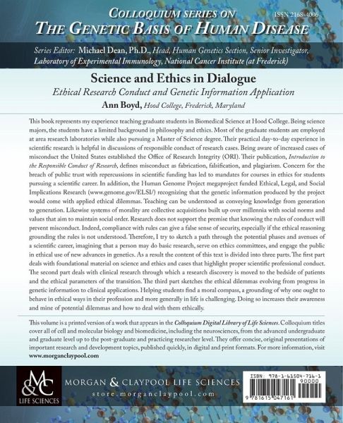 This book represents my experience teaching graduate students in Biomedical Science at Hood College. Being science majors, the students have a limited background in philosophy and ethics. Most of the graduate students are employed at area research laboratories while also pursuing a Master of Science degree. Their practical day-to-day experience in scientific research is helpful in discussions of responsible conduct of research cases. Being aware of increased cases of misconduct the United States established the Office of Research Integrity (ORI). Their publication, Introduction to the Responsible Conduct of Research, defines misconduct as fabrication, falsification, and plagiarism. Concern for the breach of public trust with repercussions in scientific funding has led to mandates for courses in ethics for students pursuing a scientific career. In addition, the Human Genome Project megaproject funded Ethical, Legal, and Social Implications Research (www.genome.gov/ELSI/) recognizing that the genetic information produced by the project would come with applied ethical dilemmas. Teaching can be understood as conveying knowledge from generation to generation. Likewise systems of morality are collective acquisitions built up over millennia with social norms and values that aim to maintain social order. Research does not support the premise that knowing the rules of conduct will prevent misconduct. Indeed, compliance with rules can give a false sense of security, especially if the ethical reasoning grounding the rules is not understood. Therefore, I try to sketch a path through the potential phases and avenues of a scientific career, imagining that a person may do basic research, serve on ethics committees, and engage the public in ethical use of new advances in genetics. As a result the content of this text is divided into three parts. The first part deals with foundational material on science and ethics and cases that highlight proper scientific professional conduct. The second part deals with clinical research through which a research discovery is moved to the bedside of patients and the ethical parameters of the transition. The third part sketches the ethical dilemmas evolving from progress in genetic information to clinical applications. Helping students find a moral compass, a grounding of why one ought to behave in ethical ways in their profession and more generally in life is challenging. Doing so increases their awareness and mine of potential dilemmas and how to deal with them ethically.