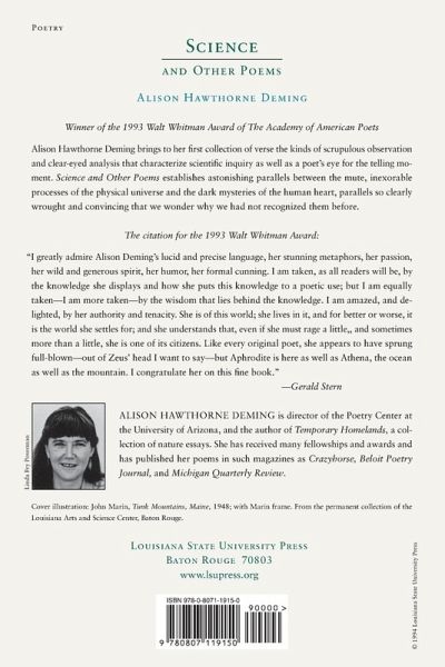 Alison Hawthorne Deming brings to her first collection of verse the kinds of scrupulous observation and clear-eyed analysis that characterize scientific inquiry as well as a poet's eye for the telling moment. Science and Other Poems establishes astonishing parallels between the mute, inexorable processes of the physical universe and the dark mysteries of the human heart, parallels so clearly wrought and convincing that we wonder why we had not recognized them before. "Caffe Trieste" lays bare the unexamined terror and sorrow that underlie the proliferation of faux fifties kitsch, then strips the veil of specious grace from the decade and reveals it as it was for those who lived it: . ...bombs spread like bacteria on culture plates, / when the cost of a family staying together might be Stelazine and / high-voltage erasures. They're just American - / all shine and no pain. In the chilling "Alliance, Ohio, " a mother and daughter suddenly find themselves stranded in a world of predators, a poisonous world charged with sexual threat, where every smile, every gesture, drips with sly menace. Yet moments of dislocation can also be cause for rejoicing, as when a speaker, after surprising a bat in the house, is moved to rapture by the sight of the night sky. Every page of Science and Other Poems is alive with startling juxtapositions, eerie parallels, abrupt shifts of tone, and image after image of crystalline perfection - as in this dazzling evocation of soft-shelled crabs: "their finely stippled bodies that give to the touch, / translucent as Japanese lanterns." These poems imbue everything, from the microscopic to the stellar, with wonder. Each instant of illumination, like poetry itself,brings the world alive with "a faithfulness deeper than seeing."