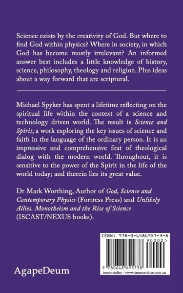 Science exists by the creativity of God. But where to find God within physics? Where in society, in which God has become mostly irrelevant? An informed answer best includes a little knowledge of history, science, philosophy, theology and religion. Plus ideas about a way forward that are scriptural. __________________________________________ Michael Spyker has spent a lifetime reflecting on the spiritual life within the context of a science and technology-driven world. The result is Science and Spirit, a work exploring the key issues of science and faith in the language of the ordinary person. It is an impressive and comprehensive feat of theological dialogue with the modern world. Throughout, it is sensitive to the power of the Spirit in the life of the world today; and therein lies its great value. Dr Mark Worthing, Author of God, Science and Contemporary Physics (Fortress Press) and Unlikely Allies. Monotheism and the Rise of Science (ISCAST/NEXUS books).