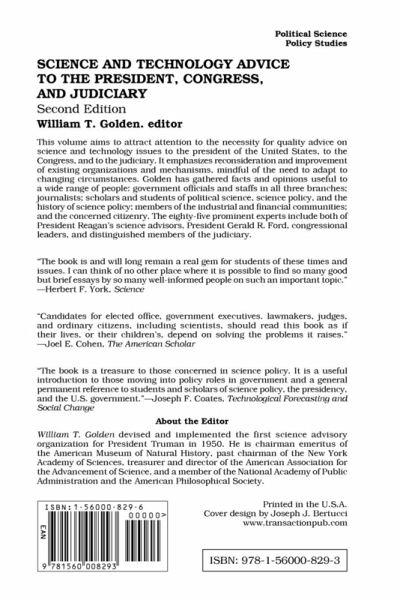 This volume aims to attract attention to the necessity for quality advice on science and technology issues to the president of the United States, to the Congress, and to the judiciary. It emphasizes reconsideration and improvement of existing organizations and mechanisms, mindful of the need to adapt to changing circumstances. Golden has gathered facts and opinions useful to a wide range of people: government officials and staffs in all three branches; journalists; scholars and students of political science, science policy, and the history of science policy; members of the industrial and financial communities; and the concerned citizenry. The eighty-five prominent experts include both of President Reagan's science advisors, President Gerald R. Ford, congressional leaders, and distinguished members of the judiciary.