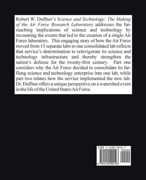 Robert W. Duffner's Science and Technology: The Making of the Air Force Research Laboratory addresses the far-reaching implications of science and technology by recounting the events that led to the creation of a single Air Force laboratory. This engaging story of how the Air Force moved from 13 separate labs to one consolidated lab reflects that service's determination to reinvigorate its science and technology infrastructure and thereby strengthen the nation's defense for the twenty-first century. Part one considers why the Air Force decided to consolidate its far-flung science and technology enterprise into one lab, while part two relates how the service implemented the new lab. Dr. Duffner offers a unique perspective on a watershed event in the life of the United States Air Force.