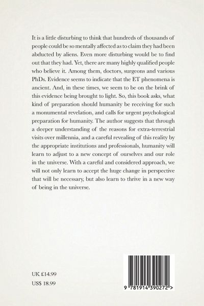 It is a little disturbing to think that hundreds of thousands of people could be so mentally affected as to claim they had been abducted by aliens. Even more disturbing would be to find out that they had. Yet, there are many highly qualified people who believe it. Among them, doctors, surgeons and various PhDs. Evidence seems to indicate that the ET phenomena is ancient. And, in these times, we seem to be on the brink of this evidence being brought to light. So, this book asks, what kind of preparation should humanity be receiving for such a monumental revelation, and it calls for urgent psychological preparation for humanity. The author suggests that through a deeper understanding of the reasons for extra-terrestrial visits over millennia, and a careful revealing of this reality by the appropriate institutions and professionals, humanity will learn to adjust to a new concept of ourselves and our role in the universe. With a careful and considered approach, we will not only learn to accept the huge change in perspective that will be necessary, but also learn to thrive in a new way of being in the universe.