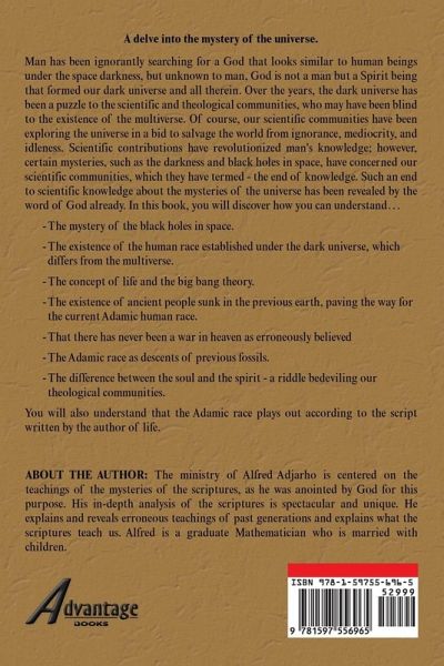 A delve into the mystery of the universe. Man has been ignorantly searching for a God that looks similar to human beings under the space darkness, but unknown to man, God is not a man but a Spirit being that formed our dark universe and all therein. Over the years, the dark universe has been a puzzle to the scientific and theological communities, who may have been blind to the existence of the multiverse. Of course, our scientific communities have been exploring the universe in a bid to salvage the world from ignorance, mediocrity, and idleness. Scientific contributions have revolutionized man's knowledge; however, certain mysteries, such as the darkness and black holes in space, have concerned our scientific communities, which they have termed - the end of knowledge. Such an end to scientific knowledge about the mysteries of the universe has been revealed by the word of God already. In this book, you will discover how you can understand... - The mystery of the black holes in space. - The existence of the human race established under the dark universe, which differs from the multiverse. - The concept of life and the big bang theory. - The existence of ancient people sunk in the previous earth, paving the way for the current Adamic human race. - That there has never been a war in heaven as erroneously believed - The Adamic race as descents of previous fossils. - The difference between the soul and the spirit - a riddle bedeviling our theological communities. You will also understand that the Adamic race plays out according to the script written by the author of life.