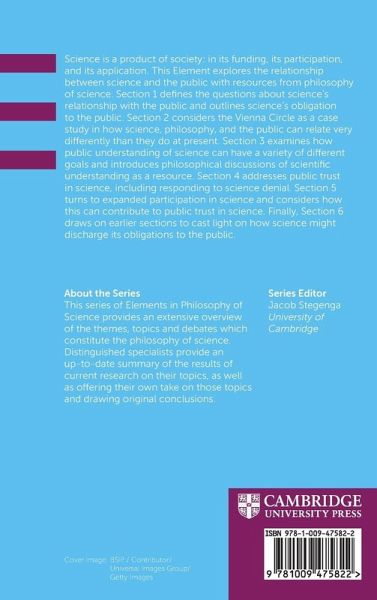 Science is a product of society: in its funding, its participation, and its application. This Element explores the relationship between science and the public with resources from philosophy of science. Chapter 1 defines the questions about science's relationship to the public and outlines science's obligation to the public. Chapter 2 considers the Vienna Circle as a case study in how science, philosophy, and the public can relate very differently than they do at present. Chapter 3 examines how public understanding of science can have a variety of different goals and introduces philosophical discussions of scientific understanding as a resource. Chapter 4 addresses public trust in science, including responding to science denial. Chapter 5 considers how expanded participation in science can contribute to public trust of science. Finally, Chapter 6 casts light on how science might discharge its obligations to the public.