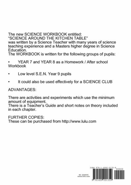 The new SCIENCE WORKBOOK entitled: "SCIENCE AROUND THE KITCHEN TABLE" was written by a Science Teacher with many years of science teaching experience and a Masters higher degree in Science Education. The WORKBOOK is written for the following groups of pupils: * YEAR 7 and YEAR 8 as a Homework / After school Workbook * Low level S.E.N. Year 9 pupils * It could also be used effectively for a SCIENCE CLUB ADVANTAGES: There are activities and experiments which use the minimum amount of equipment. There is a Teacher's Guide and short notes on theory included in each chapter. FURTHER COPIES: These can be purchased from http://www.lulu.com