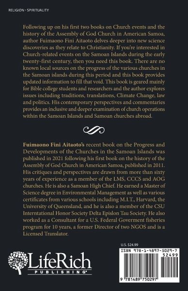 Following up on his first two books on Church events and the history of the Assembly of God Church in American Samoa, author Fuimaono Fini Aitaoto delves deeper into new science discoveries as they relate to Christianity. If you're interested in Church-related events on the Samoan Islands during the early twenty-first century, then you need this book. There are no known local sources on the progress of the various churches in the Samoan islands during this period and this book provides updated information to fill that void. This book is geared mainly for Bible college students and researchers and the author explores issues including traditions, translations, Climate Change, law and politics. His contemporary perspectives and commentaries provides an inclusive and deeper examination of church operations within the Samoan Islands and Samoan churches abroad.