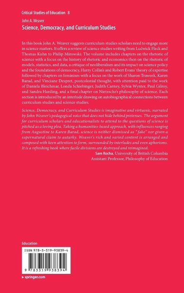 In this book John A. Weaver suggests curriculum studies scholars need to engage more in science matters. It offers a review of science studies writing from Ludwick Fleck and Thomas Kuhn to Philip Mirowski. The volume includes chapters on the rhetoric of science with a focus on the history of rhetoric and economics then on the rhetoric of models, statistics, and data, a critique of neoliberalism and its impact on science policy and the foundations of democracy, Harry Collin's and Robert Evans' theory of expertise followed by chapters on feminism with a focus on the work of Sharon Traweek, Karen Barad, and Vinciane Despret, postcolonial thought, with attention paid to the work of Daniela Bleichmar, Londa Schiebinger, Judith Carney, Sylvia Wynter, Paul Gilroy, and Sandra Harding, and a final chapter on Nietzsche's philosophy of science. Each section is introduced by an interlude drawing on autobiographical connections between curriculum studies and science studies.