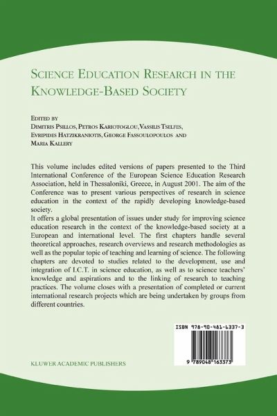 We are pleased to present the ESERA 2001 Conference book, which is based on contributions submitted and presented to the Third International Conference "Science Education Research in the Knowledge Based Society" that was organised by the Department of Primary Education of the Aristotle University of Thessaloniki and held in Thessaloniki from August 21 to August 26, 2001. The focus of the Conference was to discuss the scope, methods, outcomes and perspectives of research in science education in the context of the rapidly developing knowledge-based society. Some 450 researchers, teachers, and postgraduate students attended the conference. They came mainly from European countries, with a substantial proportion - some 20- from countries outside Europe. While ESERA conferences reflect research carried out in Europe, they are increasingly becoming international events attracting researchers from all over the world. A total of 220 works were presented in guest lectures, symposia, posterworkshops, individual papers and poster sessions that took place during the conference along with alternative activities and informal meetings. All these of the Conference (edited by works are already published in the Proceedings D. Psillos, P. Kariotoglou, V.Tselfes, G.Bisdikian, G.Fassoulopoulos, E. Hatzikraniotis, M.Kallery).