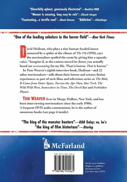 David Hedison, who plays a tiny human-headed insect menaced by a spider at the climax of The Fly (1958), says the moviemakers spoiled the scene by giving him a squeaky voice. "Imagine if, as the camera moved in closer, you actually heard me screeeeaming for my life. That is horror. That is horror." In Tom Weaver's eighth interview book, Hedison--and 22 other moviemakers--talk about their horror and science fiction movie experiences as part of such films and TV series as The Blob, It Came from Outer Space, Tarzan the Ape Man, Star Trek, The Wild Wild West, Somewhere in Time, The Devil Bat and Forbidden Planet. Among those interviewed are Dan O'Herlihy, Kate Phillips, John Alvin, Anthony Cardoza, Tod Griffin, Alex and Richard Gordon, Suzanne Kaaren, and Warren Stevens. Full credits are provided for the actors, actresses, and producers.