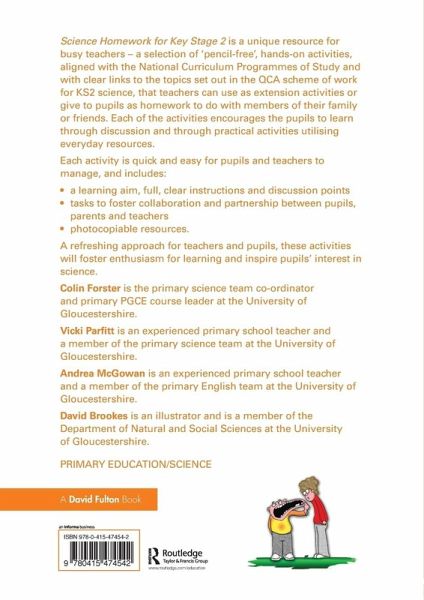 Science Homework for Key Stage 2 is a unique resource for busy teachers - a selection of 'pencil-free', hands-on activities, aligned with the National Curriculum Programmes of Study and with clear links to the topics set out in the QCA scheme of work for KS2 science, that teachers can use as extension activities or give to pupils as homework to do with members of their family or friends. Each of the activities encourages the pupils to learn through discussion and through practical activities utilising everyday resources. Each activity is quick and easy for pupils and teachers to manage, and includes: a learning aim, full, clear instructions and discussion points tasks to foster collaboration and partnership between pupils, parents and teachers photocopiable resources. A refreshing approach for teachers and pupils, these activities will foster enthusiasm for learning and inspire pupils' interest in science.