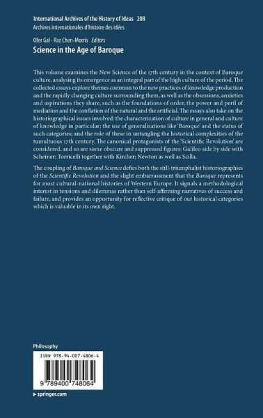 This volume examines the New Science of the 17th century in the context of Baroque culture, analysing its emergence as an integral part of the high culture of the period. The collected essays explore themes common to the new practices of knowledge production and the rapidly changing culture surrounding them, as well as the obsessions, anxieties and aspirations they share, such as the foundations of order, the power and peril of mediation and the conflation of the natural and the artificial. The essays also take on the historiographical issues involved: the characterization of culture in general and culture of knowledge in particular; the use of generalizations like 'Baroque' and the status of such categories; and the role of these in untangling the historical complexities of the tumultuous 17th century. The canonical protagonists of the 'Scientific Revolution' are considered, and so are some obscure and suppressed figures: Galileo side by side with Scheiner;Torricelli together with Kircher; Newton as well as Scilla. The coupling of Baroque and Science defies both the still-triumphalist historiographies of the Scientific Revolution and the slight embarrassment that the Baroque represents for most cultural-national histories of Western Europe. It signals a methodological interest in tensions and dilemmas rather than self-affirming narratives of success and failure, and provides an opportunity for reflective critique of our historical categories which is valuable in its own right.