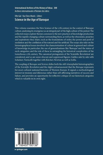 This volume examines the New Science of the 17th century in the context of Baroque culture, analysing its emergence as an integral part of the high culture of the period. The collected essays explore themes common to the new practices of knowledge production and the rapidly changing culture surrounding them, as well as the obsessions, anxieties and aspirations they share, such as the foundations of order, the power and peril of mediation and the conflation of the natural and the artificial. The essays also take on the historiographical issues involved: the characterization of culture in general and culture of knowledge in particular; the use of generalizations like 'Baroque' and the status of such categories; and the role of these in untangling the historical complexities of the tumultuous 17th century. The canonical protagonists of the 'Scientific Revolution' are considered, and so are some obscure and suppressed figures: Galileo side by side with Scheiner;Torricelli together with Kircher; Newton as well as Scilla. The coupling of Baroque and Science defies both the still-triumphalist historiographies of the Scientific Revolution and the slight embarrassment that the Baroque represents for most cultural-national histories of Western Europe. It signals a methodological interest in tensions and dilemmas rather than self-affirming narratives of success and failure, and provides an opportunity for reflective critique of our historical categories which is valuable in its own right.