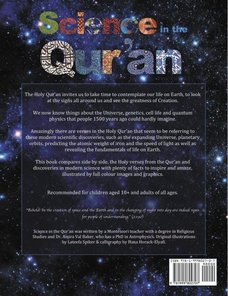 The Holy Qur'an invites us to take time to contemplate our life on Earth, to look at Nature's signs that appear all around us, and see the greatness of Creation. We now know things about the Universe, genetics, cell life and quantum physics that people 1500 years ago could hardly imagine. Amazingly, there are verses in the Holy Qur'an that seem to be referring to these modern scientific discoveries, such as the expanding Universe, planetary orbits, predicting the atomic weight of iron and the speed of light as well as revealing the fundamentals of life on Earth. This book compares side by side, the verses from the Holy Qur'an, and discoveries in modern science with plenty of facts to inspire and amaze, illustrated with full colour images and graphics. Recommended for children aged 8+ and adults of all ages. Written by Yasmin Watson, a Montessori teacher and Dr. Amira val Baker, who has a PhD in Astrophysics. Original illustrations by Lateefa Spiker and calligraphy by Hana Horack-Elyafi.