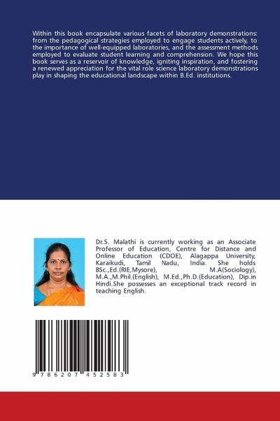 Within this book encapsulate various facets of laboratory demonstrations: from the pedagogical strategies employed to engage students actively, to the importance of well-equipped laboratories, and the assessment methods employed to evaluate student learning and comprehension. We hope this book serves as a reservoir of knowledge, igniting inspiration, and fostering a renewed appreciation for the vital role science laboratory demonstrations play in shaping the educational landscape within B.Ed. institutions.