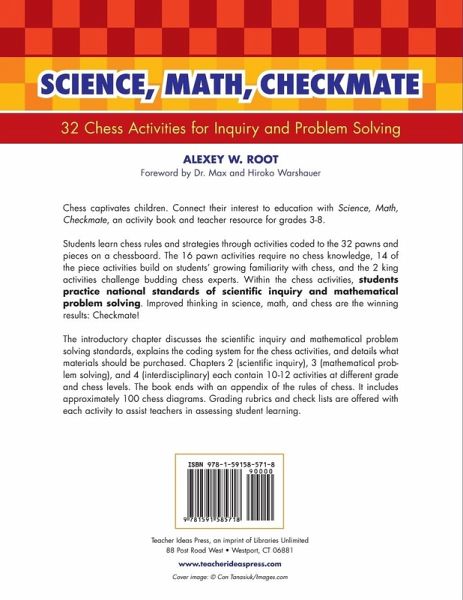 This book helps educators and librarians prepare students to succeed in University Interscholastic League (UIL) Chess Puzzle. Students learn chess rules and strategies through activities coded to the 32 pawns and pieces on a chessboard. The 16 pawn activities require no chess knowledge, 14 of the piece activities build on students' growing familiarity with chess, and the 2 king activities challenge budding chess experts. Within the chess activities, students practice national standards of scientific inquiry and mathematical problem solving. Improved thinking in science, math, and chess are the winning results: Checkmate! The introductory chapter discusses the scientific inquiry and mathematical problem solving standards, explains the coding system for the chess activities, and details what materials should be purchased. Chapters 2 (scientific inquiry), 3 (mathematical problem solving), and 4 (inter-disciplinary) each contain 10-12 activities at different grade and chess levels. The book ends with an appendix of the rules of chess. It includes approximately 100 chess diagrams. Grading rubrics and check lists are offered with each activity to assist teachers in assessing student learning.