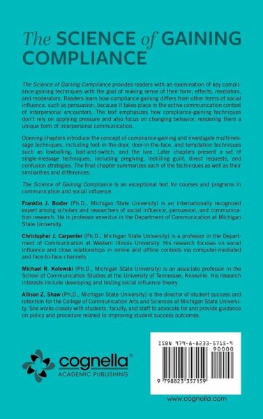 The Science of Gaining Compliance provides readers with an examination of key compliance-gaining techniques with the goal of making sense of their form, effects, mediators, and moderators. Readers learn how compliance-gaining differs from other forms of social influence, such as persuasion, because it takes place in the active communication context of interpersonal encounters. The text emphasizes how compliance-gaining techniques don't rely on applying pressure and also focus on changing behavior, rendering them a unique form of interpersonal communication. Opening chapters introduce the concept of compliance-gaining and investigate multimessage techniques, including foot-in-the-door, door-in-the-face, and temptation techniques such as lowballing, bait-and-switch, and the lure. Later chapters present a set of single-message techniques, including pregiving, instilling guilt, direct requests, and confusion strategies. The final chapter summarizes each of the techniques as well as their similarities and differences. The Science of Gaining Compliance is an exceptional text for courses and programs in communication and social influence. Franklin J. Boster (Ph.D., Michigan State University) is an internationally recognized expert among scholars and researchers of social influence, persuasion, and communication research. He is professor emeritus in the Department of Communication at Michigan State University. Christopher J. Carpenter (Ph.D., Michigan State University) is a professor in the Department of Communication at Western Illinois University. His research focuses on social influence and close relationships in online and offline contexts via computer-mediated and face-to-face channels. Michael R. Kotowski (Ph.D., Michigan State University) is an associate professor in the School of Communication Studies at the University of Tennessee, Knoxville. His research interests include developing and testing social influence theory. Allison Z. Shaw (Ph.D., Michigan State University) is the director of student success and retention for the College of Communication Arts and Sciences at Michigan State University. She works closely with students, faculty, and staff to advocate for and provide guidance on policy and procedure related to improving student success outcomes.