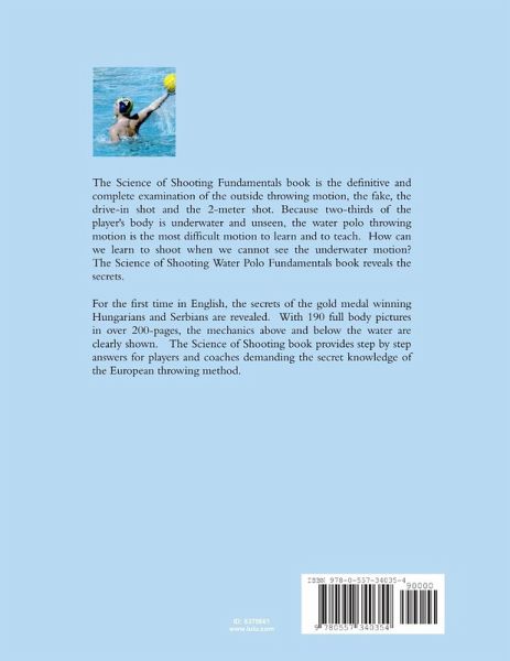 The Science of Shooting Fundamentals book is the definitive and complete examination of the outside throwing motion, the fake, the drive-in shot and the 2-meter shot. Because two-thirds of the player's body is underwater and unseen, the water polo throwing motion is the most difficult motion to learn and to teach. How can we learn to shoot when we cannot see the underwater motion? The Science of Shooting Water Polo Fundamentals book reveals the secrets. For the first time in English, the secrets of the gold medal winning Hungarians and Serbians are revealed. With 190 full body pictures in over 200-pages, the mechanics above and below the water are clearly shown. The Science of Shooting book provides step by step answers for players and coaches demanding the secret knowledge of the European throwing method.