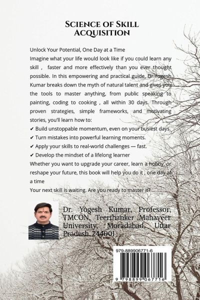 Science of Skill Acquisition: The 30-Day Game Plan Unlock Your Potential, One Day at a Time Imagine what your life would look like if you could learn any skill, faster and more effectively than you ever thought possible. In this empowering and practical guide, Dr.Yogesh Kumar breaks down the myth of natural talent and gives you the tools to master anything, from public speaking to painting, coding to cooking, all within 30 days. Through proven strategies, simple frameworks, and motivating stories, you'll learn how to: ✔️ Build unstoppable momentum, even on your busiest days. ✔️ Turn mistakes into powerful learning moments. ✔️ Apply your skills to real-world challenges, fast. ✔️ Develop the mindset of a lifelong learner. Whether you want to upgrade your career, learn a hobby, or reshape your future, this book will help you do it, one day at a time.