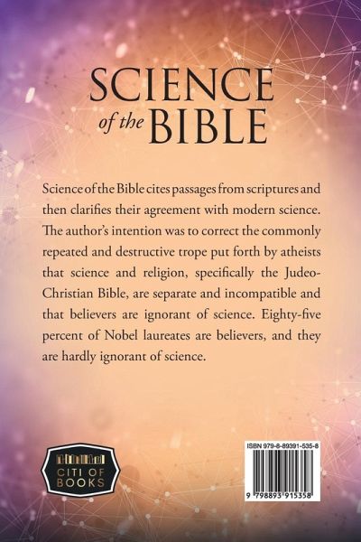Science of the Bible cites passages from scriptures and then clarifies their agreement with modern science. The author's intention was to correct the commonly repeated and destructive trope put forth by atheists that science and religion, specifically the Judeo-Christian Bible, are separate and incompatible and that believers are ignorant of science. Eighty-five percent of Nobel laureates are believers, and they are hardly ignorant of science.