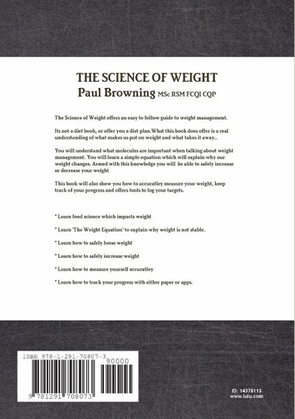 * Learn food science which impacts weight * Learn 'The Weight Equation' to explain why weight is not stable. * Learn how to safely loose weight * Learn how to safely increase weight * Learn how to measure yourself accuratley * Learn how to track your progress with either paper or apps. The Science of Weight offers an easy to follow guide to weight management. Its not a diet book, or offer you a diet plan. What this book does offer is a real understanding of what makes us put on weight and what takes it away. You will understand what molecules are importamnt when talking about weight management. You will learn a simple equation which will explain why our weight changes. Armed with this knowledge you will be able to safely increase or decrease your weight. This book will also show you how to acuratley measure your weight, keep track of your progress and offers tools to log your targets.