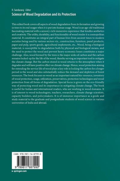This edited book covers all aspects of wood degradation from its formation and growing in trees to its end usages when it is put into human usage. Wood is an age-old traditional fascinating material with a sensory-rich immersive experience that kindles aesthetics and creativity. The utility, durability, and functionality of wood render it a cosmopolitan material. It constitutes an integral part of human lives from ancient times to modern societies being used by various sectors viz., construction, furniture, panel products, paper and pulp, sports goods, agricultural implements, etc., Wood, being a biological material, is susceptible to degradation both by physical and biological means, and the need to protect the wood and prevent heavy economic losses constitutes a major challenge. Also, wood formed by the trees is the major sinks of carbon and the carbon remains locked-up for the life of the wood, thereby serving as important tool to mitigate the climate change. But the carbon stored in wood returns to the atmosphere when it degrades and will have positive effect on climate change. Hence, wood protection aiming for extending the service life of wood plays a key role in locking the carbon for a longer period in the wood and also substantially reduce the demand and depletion of forest resources. The book focuses on wood as an important natural bio-resource, inventory of wood protection, usage, utilization, preservatives, protection technologies and wood protection from all forms of degradation. Special focus is given on the eco-friendly way of protecting wood and its importance in mitigating climate change. The book is useful for Indian and international readers, who are working in wood domains. It is of interest to wood technologists, teachers, researchers, climate change scientists, capacity builders, and policymakers. It is of immense importance as a guide and study material to the graduate and postgraduate students of wood science in various universities of India and abroad.